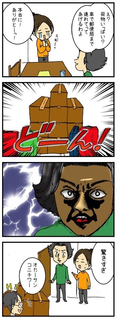 母の反応 2014年04月15日 むしろコレが普通の反応なのだろうか。 ↑よろしければ、ポチッとお願いします↑ 「夫婦の日常」カテゴリの最新記事 < 前の記事次の記事 > コメント コメント一覧 (9) 2. ムッキー 2014年04月15日 20:07 >きじとら。さん あの迫力は本当に感慨深いものがありますよw おそらく年末帰国時も同じ状況になると思うので、その時写真撮ってブログに載せます( ̄∇ ̄+) 3. ☆102noCAD☆ 2014年04月15日 21:01 何処の家でも同じですよ^_^ うん。 8. チョココ 2014年10月04日 09:55 パソコン画面を拡大して、コマをスクロールさせながら拝見しているのですが、、、 お母様のお顔が出てきて思わず吹きました! (ちなみに今図書館みたいなところにいます!) でもほんと、送るのも大変だけど、しまう場所も大変ですね…(´▽`;) 9. ムッキー 2014年10月05日 00:27 >チョココさん コメント有難うございます~! この母の驚いた顔は、めちゃくちゃ時間かけて描いた記憶がありますw 良かった、笑っていただいてヽ(*'∀`*)ノ 本当、しまうのは毎日の重大な課題ですよ~! 5. 亀太郎 2014年04月15日 23:00 本当に届けてくれるの?^-^- 1. きじとら。 2014年04月15日 18:31 爆笑しましたw 普通の反応ですよね(^^;; 6. ムッキー 2014年04月15日 23:16 >亀太郎さん コメント有難うございます! 私も1箱か2箱、紛失するんじゃ無いかと思ってましたが、無事届きましたよー! 母と郵便局に感謝! 4. ムッキー 2014年04月15日 21:32 >☆102noCAD☆さん うおおお、本当ですか!! オタクの妻の心得が知りたいです(ノ_-。) 7. マイ 2014年05月06日 12:24 。+゚☆゚+。★。+゚☆゚記事見ました。応援したくなっちゃったのでペタの代わりにコメ書いておきます(*'ω'*)また遊びに来ます♪頑張って下さいね。+゚☆゚+。★。+゚☆゚