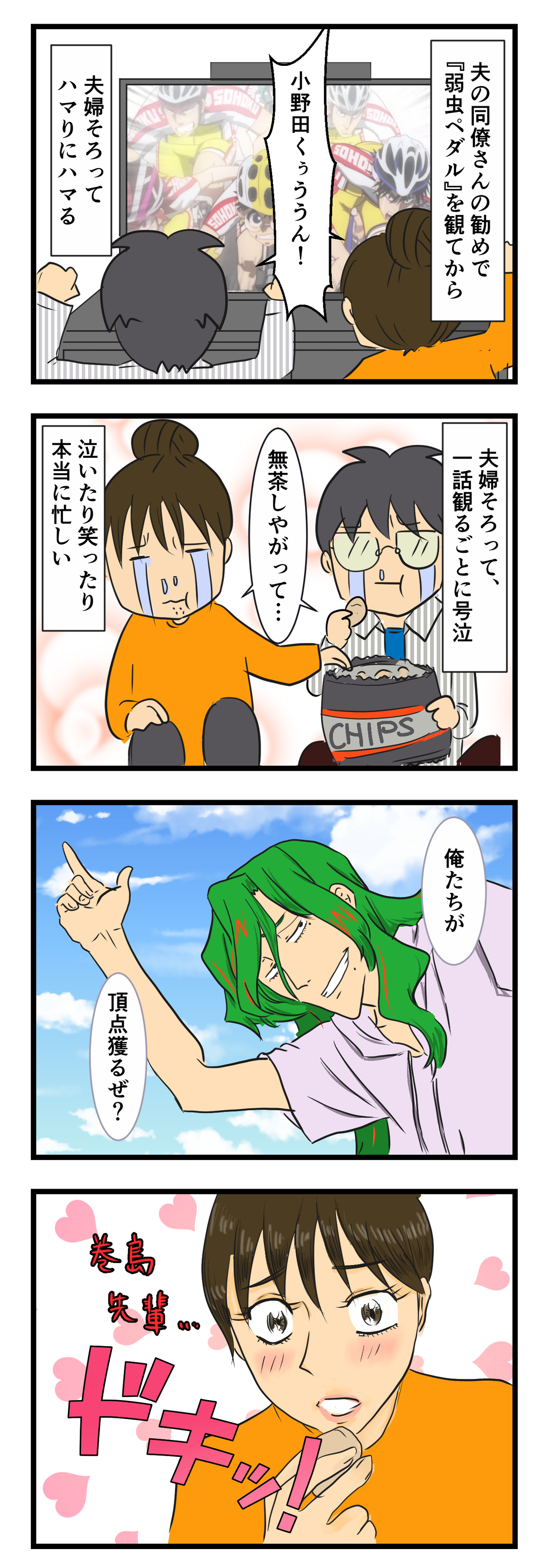 いつも読み逃げですみません…。弱虫ペダル良いですよね〜!でも涙腺弱くなったからか、母的な気持ちで見てしまって、ソコ?って言われるとこでも泣いてます笑(うち、兄弟姉妹揃ってアニメみるんで…)