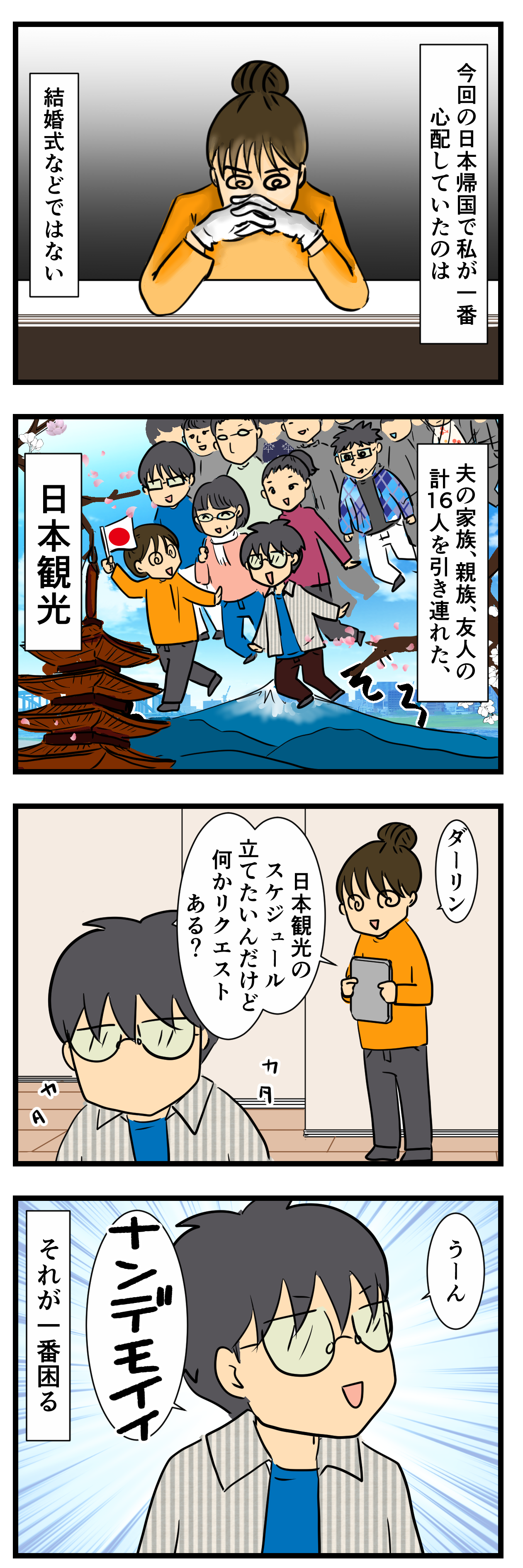 私もアメリカ人と結婚しているんですけど、去年の冬に日本で結婚式+彼の家族総勢12人連れツアーin Kyotoしました。もうしないです(笑)同じくどこでもいい、って言っていました(困るやつ)でも小さい子供連れ家族もいたりいなかったりでどこに連れて行けば!?!?あと寺など「THE☆JAPAN」というものはあまり興味がなかったみたいで、日本らしいことと言えばレンタル着物くらいでした・・・。あとどこで何を食べるか、これですね。アメリカ人って朝食・昼食・夕食と時間が来たら食べる、というよりもお腹がすいたら食べる、おいしそうなものをみつけたら食べる、という風でみんなでそろって落ち着いて食事、はほぼしなかったです。一人が商店街?等でクレープを見つけたら食べる、え、今からランチ・・・・(゜_゜)・・・・。んで何が食べたい?と聞けばそろって「ラーメン!」←(毎食)。私は京都にいるのにラーメンばっかり食べたくない!!と思ってうどんへ逃げていました。ラーメン屋に何人もぞろぞろ連れて行くのは迷惑極まりないとも思ってヒヤヒヤしました~。あと声もでかくてホテルのロビー等もヒヤヒヤ~・・・電車もヒヤヒヤ~・・・(;´Д`)思い出すだけでドッと疲れます。ムッキーさんもお疲れさまでした!