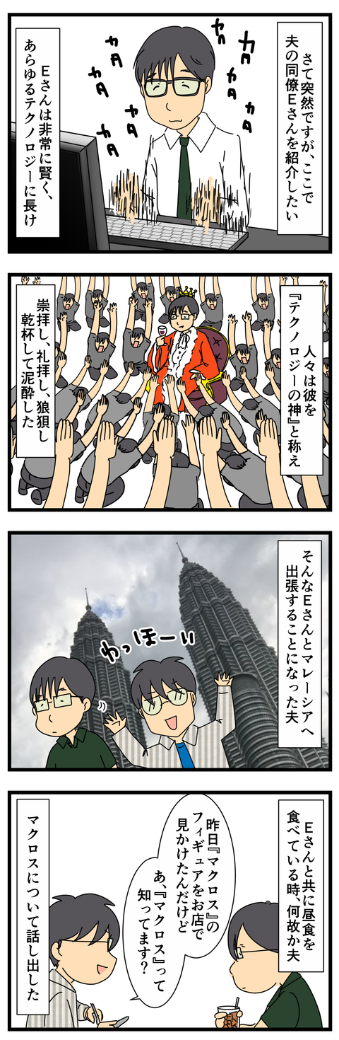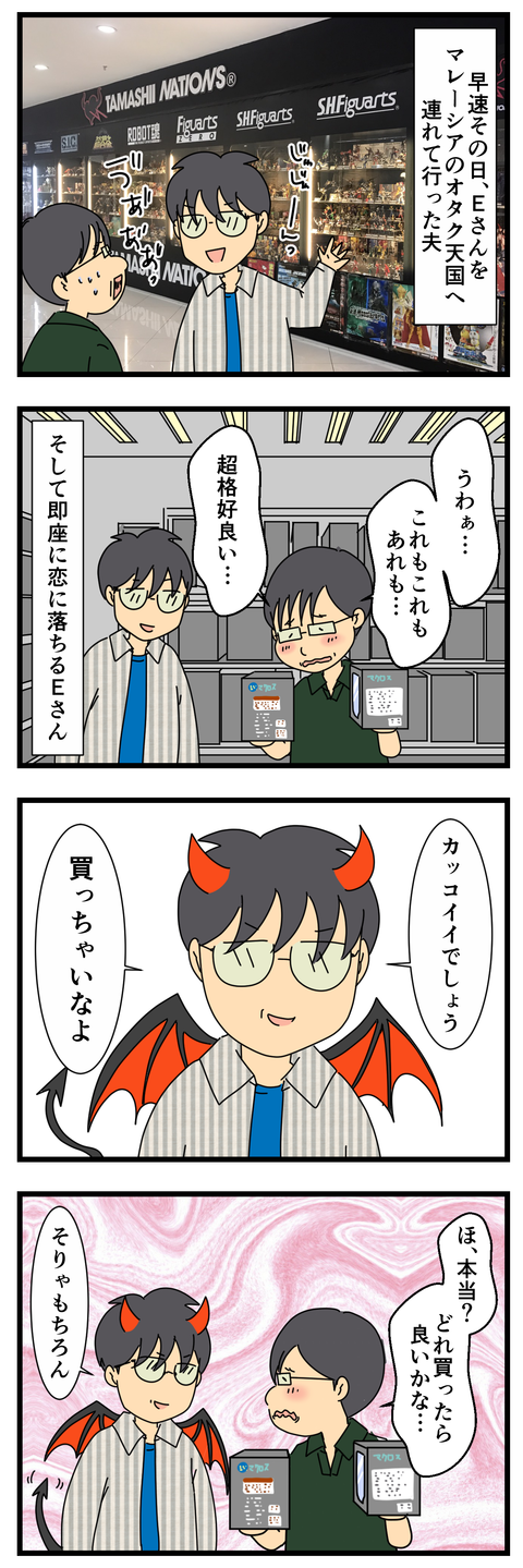 夫の同僚Eさん その2 夫との出会いはこちら夫の同僚Eさん その1はこちら つづく!マレーシアのフィギュアさん ↑たくさんのフィギュアにただ立ち尽くすEさん↑フィギュアを手にしながらどれを買うか迷っているEさん↑ついに1つのフィギュア購入決意後、またしても魅惑のフィギュアたちを眺め ... 2017年04月18日 続きを読む