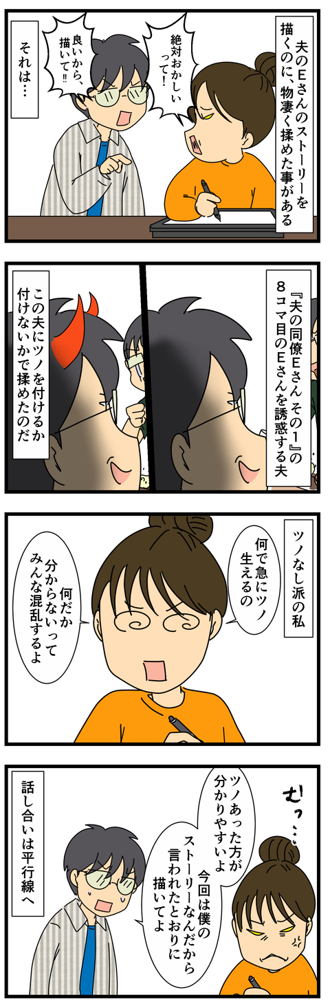 ツノを付けるか、付けないか 夫との出会いは こちら 夫の同僚Eさん その1はこちら 夫の同僚Eさん その₂はこちら 夫の同僚Eさん その3はこちら このストーリーの8コマ目 ... 2017年04月20日 続きを読む