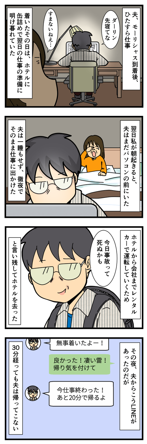 夫はこんなに仕事してるのに! 夫との出会いはこちら【あらすじ】夫出張でモーリシャスへ!私も自腹で夫についてきた!夫の分も日光浴するからね…!…と思ったけど、ブログストックが全然出来てなくて、ホテルの一室でずっと漫画描いているいつも通りの日々…なんのためのモーリシャス…( ;∀;)↑これを ... 2018年02月26日 続きを読む
