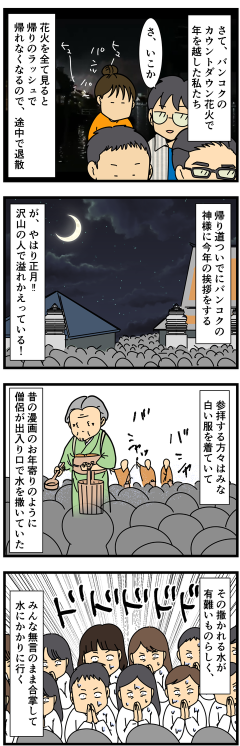 お正月早々水被る 【あらすじ】新居買った!引っ越し作業中に漫画アニメオタクな夫はタイへ長期出張!私は一人暮らしを満喫していたが、ついに私もタイへ!タイ編目次はこちら!この日行ったのはワットアルン(暁の寺)という所!上に上がる時は靴を脱がなければならないのだけど、足汚れるし、 ... 2019年01月15日 続きを読む