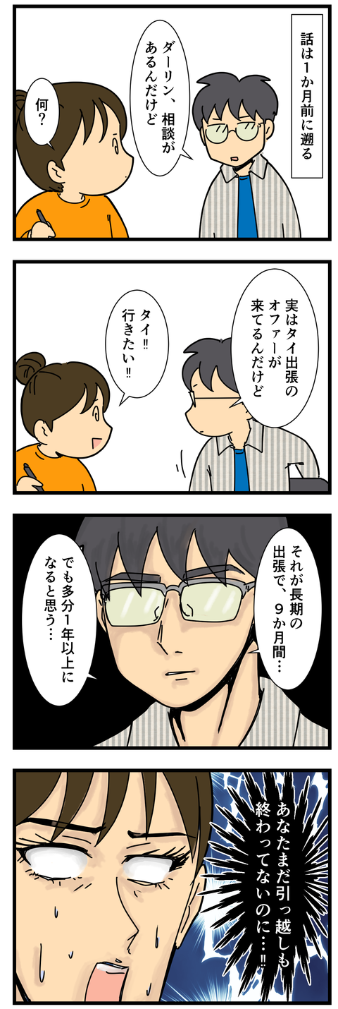 え?私も一緒にタイに行くんじゃないの…?? ごめんなさい…!更新遅くなりました!!夫との出会いはこちら引っ越し一覧はこちら【あらすじ】新居買った!引っ越し作業中に夫はタイへ長期出張!私は3週間一人暮らし後、夫を追ってタイへ!…と思ってたら夫シドニーに一時帰国するらしい!その後一緒にタイへ!!…のは ... 2018年10月21日 続きを読む